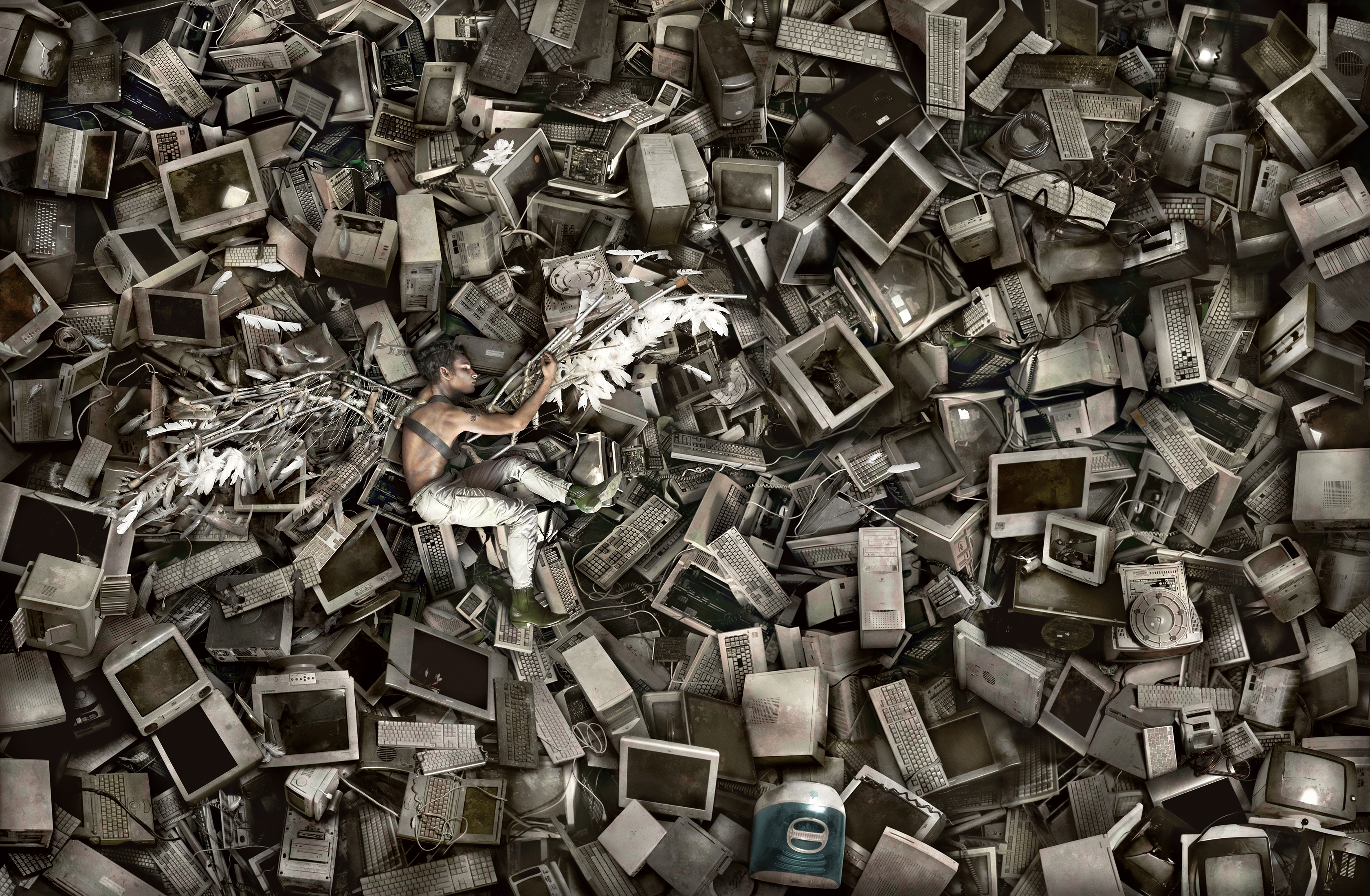 Within this context emerges Icarus, inspired by the Greek myth that tells the story of a young man in search of freedom, exalted by the euphoria of being able to fly with wings made of wax and feathers. He flew too close to the sun; the wax gradually melted, the feathers began to fall, and Icarus tragically plunged into the abyss of the sea. In this visual allegory, LaChapelle portrays the condition of the human being in the age of consumerism, highlighting its darker side. In the work, the artist represents a hypermodern Icarus, depicted as an erotic body, exposed and worn down by his illusion of reaching the heights of freedom. The boy ends up exactly like the pathological dependent, convinced he can rely solely on himself and achieve a desperate form of self-sufficiency through his object of dependency, only to be burned and consumed by it. The young man thus falls toward his ruin, plunging into an artificial valley of computers and screens, objects of his own alienation.
